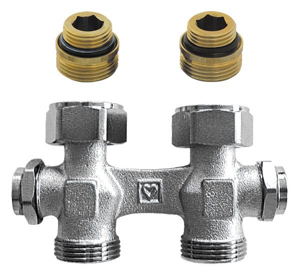 Узел подключения ГЕРЦ-3000, проходной. Межцентровое расстояние 50 мм, подключение к радиатору Rp 1/2. В комплект входят 2 переходных ниппеля 1 3002 31. Наружная резьба со стороны трубы для фитингов G 3/4, присоединение “евроконус”. Фитинги для присоединения труб заказываются отдельно.