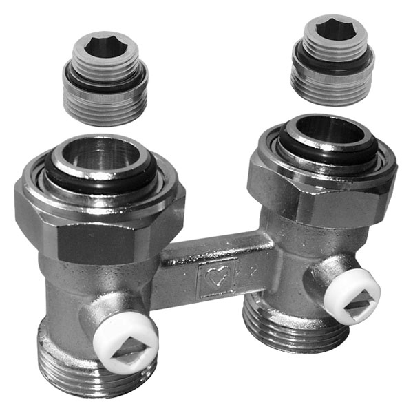 Узел подключения HERZ PROJECT (ГЕРЦ ПРОЕКТ), проходной.Межцентровое расстояние 50 мм, подключение к радиатору Rp 1/2 накидной гайкой. В комплект входят 2 переходных ниппеля 1 3002 12. Наружная резьба со стороны трубы для фитингов G 3/4, присоединение “евроконус”. Фитинги для присоединения труб заказываются отдельно.
