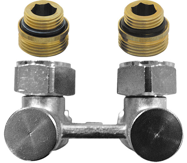 Узел подключения ГЕРЦ-3000, угловой. Межцентровое расстояние 50 мм, подключение к радиатору Rp 1/2. В комплект входят 2 переходных ниппеля. Наружная резьба со стороны трубы для фитингов G 3/4, присоединение “евроконус”. Фитинги для присоединения труб заказываются отдельно.